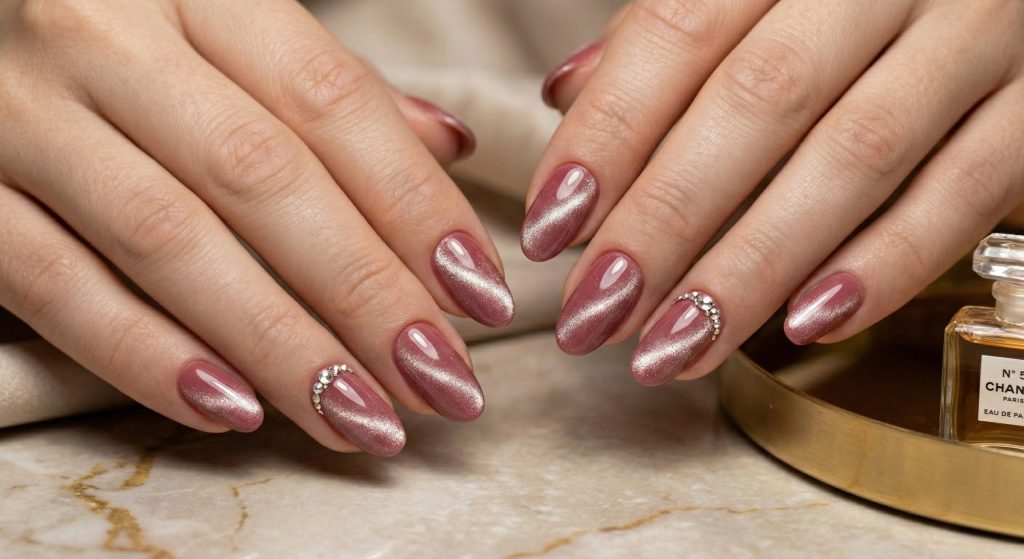 Dla klientek pragnących odrobiny magii i blasku na 8 marca, idealną stylizacją paznokci będzie Velvet Cat Eye. Używając specjalnych lakierów magnetycznych, nasze stylistki tworzą na paznokciach efekt przypominający luksusowy, miękki aksamit. Szczególnie polecamy odcienie przydymionego różu i szampana. Światło odbija się od magnetycznych drobinek w taki sposób, że paznokcie wydają się wręcz trójwymiarowe. To stylizacja pełna uroku, idealna na wieczorne wyjście z okazji Twojego święta.