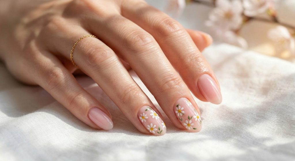 Nie ma Dnia Kobiet bez kwiatów! Jeśli uwielbiasz artystyczny manicure, zakochasz się w mikroskopijnych zdobieniach florystycznych. Na transparentnej lub bladoróżowej bazie nasze artystki ręcznie malują maleńkie stokrotki, tulipany lub niezapominajki. Ważne, aby wzór był delikatny, rozsiany tylko na jednym lub dwóch paznokciach, pozostawiając resztę płytki w neutralnym kolorze. To urocza, niesamowicie kobieca i radosna stylizacja, idealna do wiosennych sukienek.