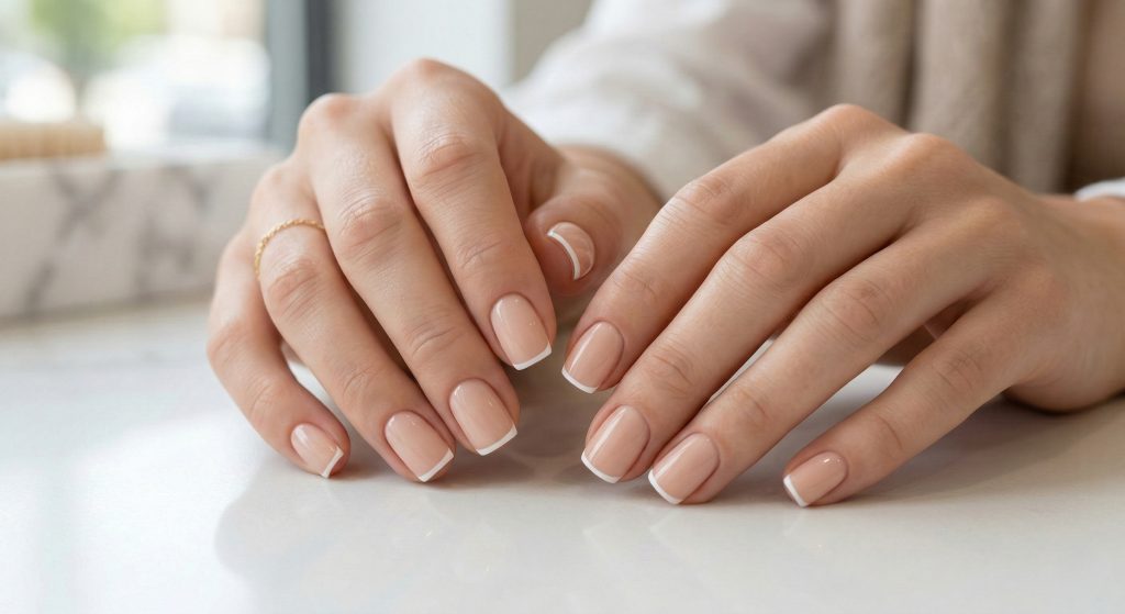 Szukasz eleganckiego manicure na Dzień Kobiet, który zachwyca precyzją? Micro French to definicja nowoczesnej elegancji. W tej stylizacji tradycyjny, biały pasek na końcówce paznokcia jest zredukowany do absolutnego minimum – cieniuteńkiej, mikroskopijnej linii. Taka stylizacja wygląda rewelacyjnie na naturalnie wyglądającej, beżowej bazie. Jest to ukłon w stronę nurtu „Clean Girl Aesthetic” – dłonie wyglądają na nieskazitelnie czyste, zdrowe i wyrafinowane.