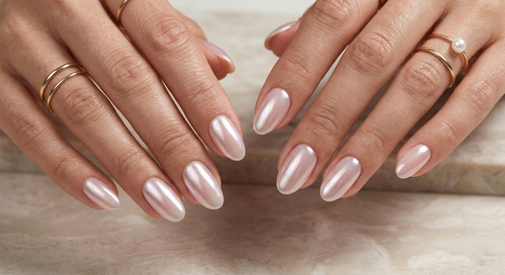 Jeśli śledzisz nowinki kosmetyczne, ten trend na pewno nie umknął Twojej uwadze. Efekt „lukrowanego pączka” (Glazed Donut nails) to prawdziwy hit, który doskonale wpisuje się w inspiracje na Dzień Kobiet. Baza w kolorze półtransparentnego, chłodnego różu lub mlecznej bieli zostaje pokryta specjalnym pyłkiem, który nadaje płytce niesamowity, perłowy, mokry blask. W świetle wiosennego słońca te paznokcie mienią się subtelnymi, perłowymi refleksami, przyciągając wzrok, ale nie przytłaczając całej stylizacji.