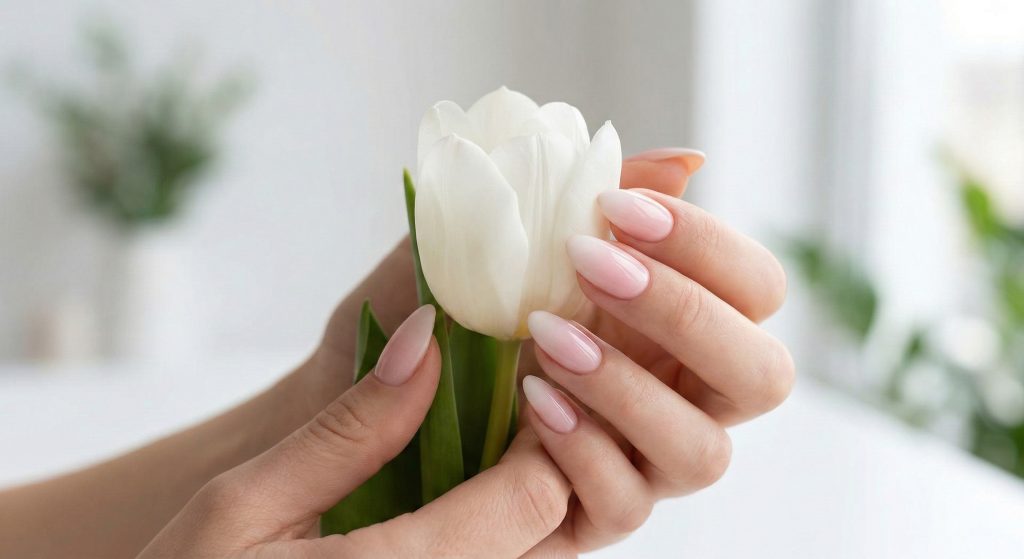 Zestawienie zamyka absolutny hit ostatnich miesięcy – mleczne paznokcie. Odcień „Milky White” to nie jest zwykła kreda; to półprzezroczysta, lekko rozmyta biel przypominająca mleko. Wygląda niezwykle elegancko, świeżo i nowocześnie. W połączeniu z kształtem migdała sprawia, że dłonie wyglądają na smukłe i wypoczęte. To doskonała, uniwersalna baza pod pierścionki i świetny wybór na Dzień Kobiet, jeśli chcesz, by Twoje dłonie mówiły: „jestem zadbana w każdym detalu”.
